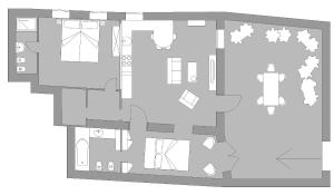 W apartamencie znajdują się dwie osobne sypialnie, salon oraz dwie łazienki wyposażone zarówno w wannę, jak i prysznic. W pełni wyposażony aneks kuchenny obejmuje piekarnik, zmywarkę, lodówkę, czajnik elektryczny, ekspres do kawy oraz zestaw do parzenia herbaty i kawy. Dodatkowe udogodnienia to pralka, żelazko z deską do prasowania, łóżeczko dziecięce na życzenie oraz telewizor.