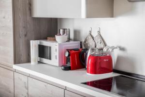Les appartements offrent un confort optimal avec la climatisation dans toutes les pièces ainsi que des téléviseurs à écran plat. Chaque unité comprend plusieurs lits totalisant huit couchages pour les deux appartements ainsi que des salles de bains privatives équipées de douches ou baignoires, bidets, sèche-cheveux, shampoing et savon pour le corps. Les équipements supplémentaires incluent le chauffage, un fer et une planche à repasser, des canapés ou canapés-lits pour créer des espaces détente ainsi que des armoires ou dressings.